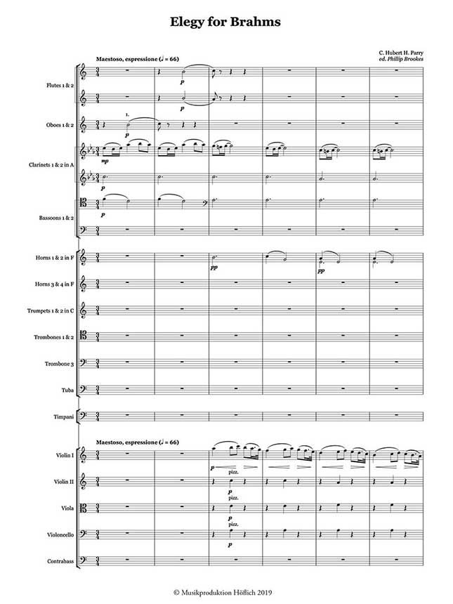 Parry starb im Oktober 1918, und am Royal College of Music wurde ein Gedenkkonzert für ihn veranstaltet, bei dem Stanford die Elegie für Brahms dirigierte - ihre erste Aufführung. Danach wurde sie in der Bibliothek aufbewahrt, bis Sir Adrian Boult sie 1978 in der letzten Sitzung seiner 58-jährigen Aufnahmekarriere aufnahm. Die vorliegende MPH-Partitur korrigiert dies.