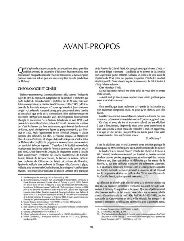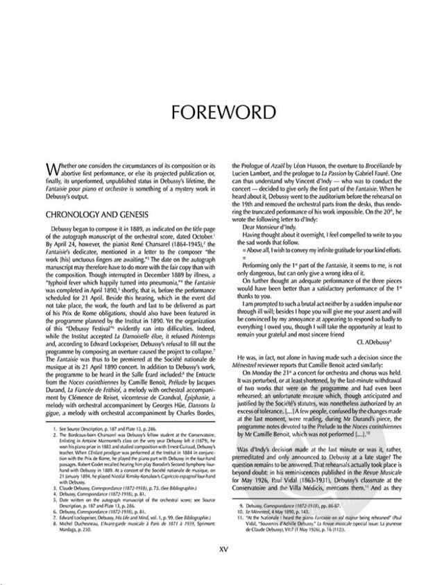 Diese erste Fassung von Claude Debussys Fantaisie pour piano et orchestre, die zwischen 1889 und 1890 entstand, wurde zu Lebzeiten des Komponisten weder aufgeführt noch veröffentlicht. Erst ein Jahr nach seinem Tod, im Jahr 1919, wurde diese erste Fassung in London mit Alfred Cortot als Solist und anschließend in Paris mit Marguerite Long am Klavier uraufgeführt. Dieser Band der COMPLETE WORKS OF CLAUDE DEBUSSY, Series V, Vol. 2, wird von dem Pianisten Christophe Grabowski herausgegeben (der bereits einen Band für das OCCD herausgegeben hatte), mit einem historischen Vorwort von Denis Herlin. Diese Publikation basiert in erster Linie auf zwei autographen Manuskripten, der Orchesterpartitur und dem Soloklavierpart.