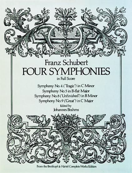 Symphony No 4 'The Tragic'', 'No. 5', 'No. 8 'The Unfinished'' and 'No. 9 'The Great''. Breitkopf & Hortel edition.