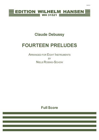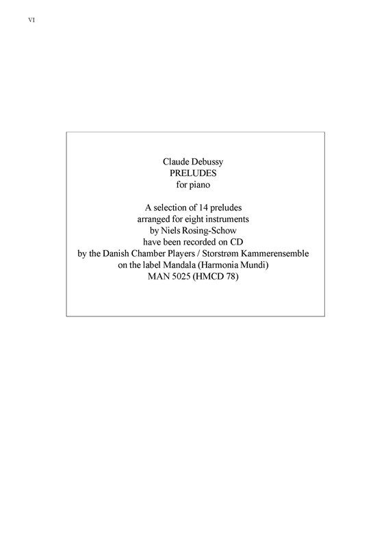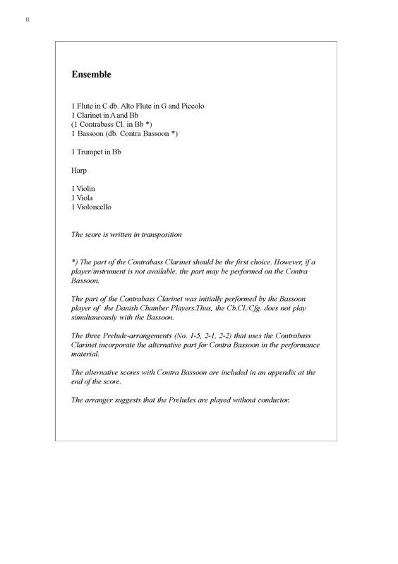 Ensemble: 1 Flute in C db. Alto Flute in G and Piccolo1 Clarinet in A and Bb (1 Contrabass Cl. in Bb *) 1 Bassoon (db. Contra Bassoon *) 1 Trumpet in Bb, Harp1, Violin1, Viola1, Violoncello. The score is written in transposition*) The part of the Contrabass Clarinet should be the first choice. However, if a player/instrument is not available, the part may be performed on the Contra Bassoon. The part of the Contrabass Clarinet was initially performed by the Bassoon player of the Danish Chamber Players. Thus, the Cb. Cl. /Cfg. does not play simultaneously with the Bassoon. The three Prelude-arrangements (No. 1-5, 2-1, 2-2) that uses the Contrabass Clarinet incorporate the alternative part for Contra Bassoon in the performance material. The alternative scores with Contra Bassoon are included in an appendix at the end of the score. The arranger suggests that the Preludes are played without conductor.