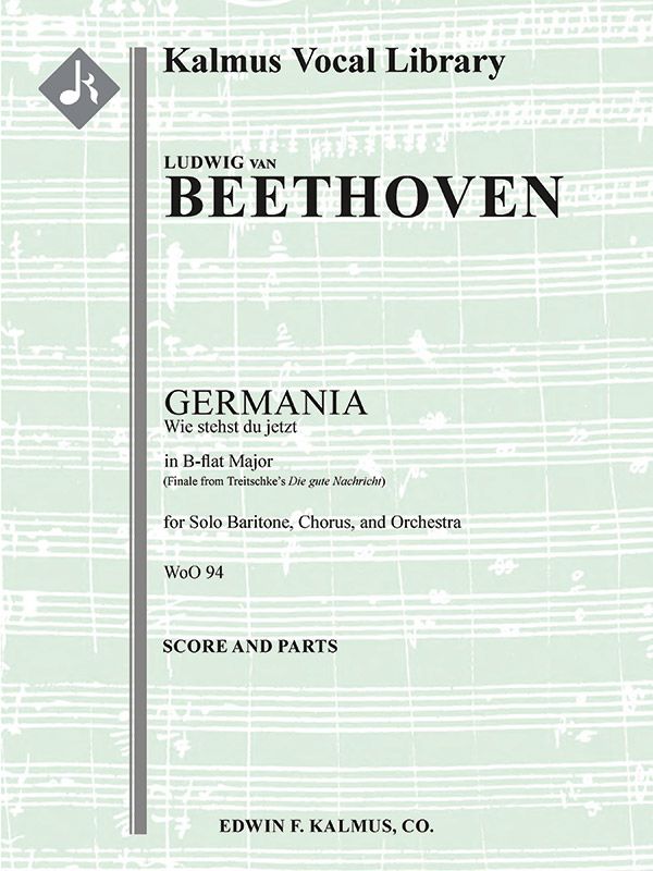 Nach der Niederlage Napoleons in seinem Feldzug von 1813 gewann der deutsche Patriotismus an Popularität. Dieser Trend hatte einen starken Einfluss auf die Dichtung und Musik der Zeit. 1814 verfasste Friedrich Treitschke die patriotische Oper DIE GUTE NACHRICHT, an der mehrere Wiener Komponisten mitwirkten, darunter Ludwig van Beethoven (1770-1827). Er steuerte die Musik für das Schlussstück bei, ein Lied, das in fünf patriotischen Strophen den deutschen Mut feiert. Die Uraufführung von GERMANIA, WoO 94, fand am 11. April 1814 im Theater am Kärntnertor in Wien statt. Besetzung: 2.2.2.2: 2.2.0.0: Timp: Str (9.8.7.6.5 im Satz): Solo [Bariton]: Mx Chor.