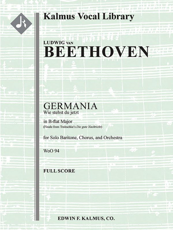 Nach der Niederlage Napoleons in seinem Feldzug von 1813 gewann der deutsche Patriotismus an Popularität. Dieser Trend hatte einen starken Einfluss auf die Dichtung und Musik der Zeit. 1814 verfasste Friedrich Treitschke die patriotische Oper DIE GUTE NACHRICHT, an der mehrere Wiener Komponisten mitwirkten, darunter Ludwig van Beethoven (1770-1827). Er steuerte die Musik für das Schlussstück bei, ein Lied, das in fünf patriotischen Strophen den deutschen Mut feiert. Die Uraufführung von GERMANIA, WoO 94, fand am 11. April 1814 im Theater am Kärntnertor in Wien statt. Besetzung: 2.2.2.2: 2.2.0.0: Timp: Str (9.8.7.6.5 im Satz): Solo [Bariton]: Mx Chor.
