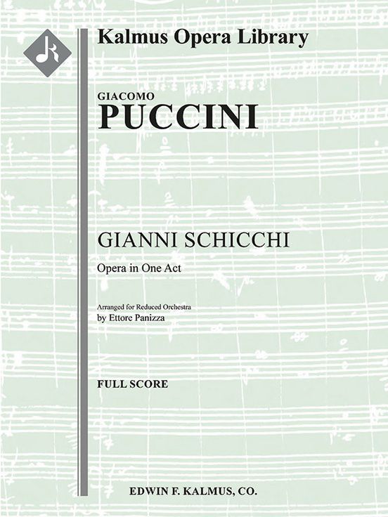 Gianni Schicchi is a one-act comic opera by Giacomo Puccini (1858-1924). The final and most popular opera in a trio known as Il trittico (The Triptych), each one dealing with the concealment of a death, the work premiered at the Metropolitan Opera on December 14, 1918. It tells the story of four family members anxiously discussing the contents of their very recently deceased family member, Buoso Donati, only to discover to their horror that he had left everything to a monastery. Gianni Schicchi, not related to the family, arrives and concocts a scheme to have a new will written as nobody but the family knows Buoso is dead. But when the notary arrives Schicchi, pretending to be a Buoso on the mend, dictates that his house, mule, and mills should be left to Gianni Schicchi, which allows him to offer marriage between his daughter Lauretta and Donati family member Rinuccio. Lauretta's soprano aria, O mio babbino caro (Oh, my dear papa), is among the most well known in opera and is frequently sung as an encore in recitals or concerts. Instrumentation: 2(2nd dPicc).1.2.1: 2.2.1.0: Timp.Perc(3): Harp.Clst: Str (4-4-3-3-3 in set): Vocal soli (15 roles, SSSAATTBBBBBBBB). This orchestra reduction is completed by Ettore Panizza. Reprint edition.