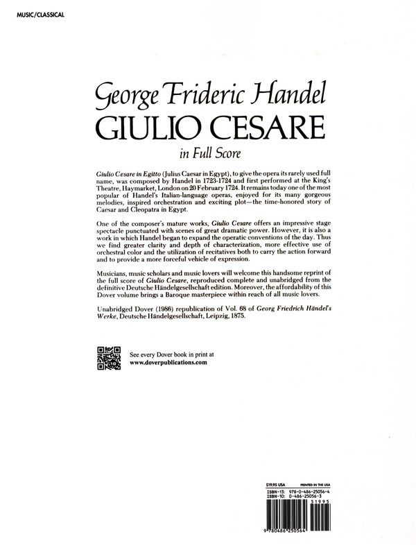 Musicians, scholars and music lovers will welcome this handsome reprint of the full score of Giulio Cesare, reproduced complete andunabridgedfrom the definitive Deutsche Handelgesellschaft edition.