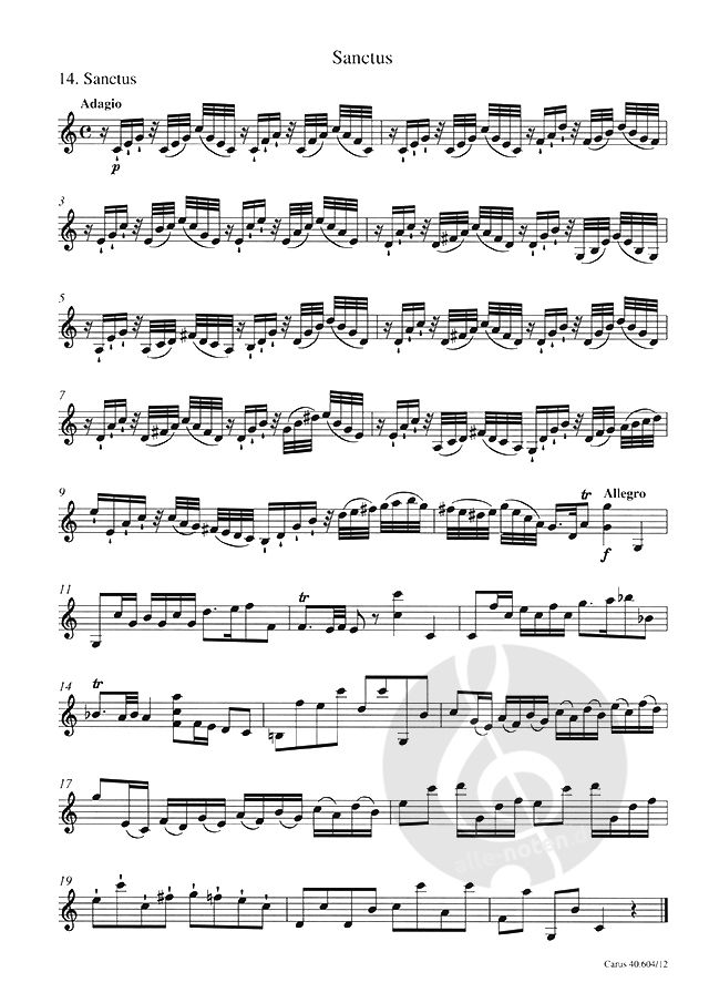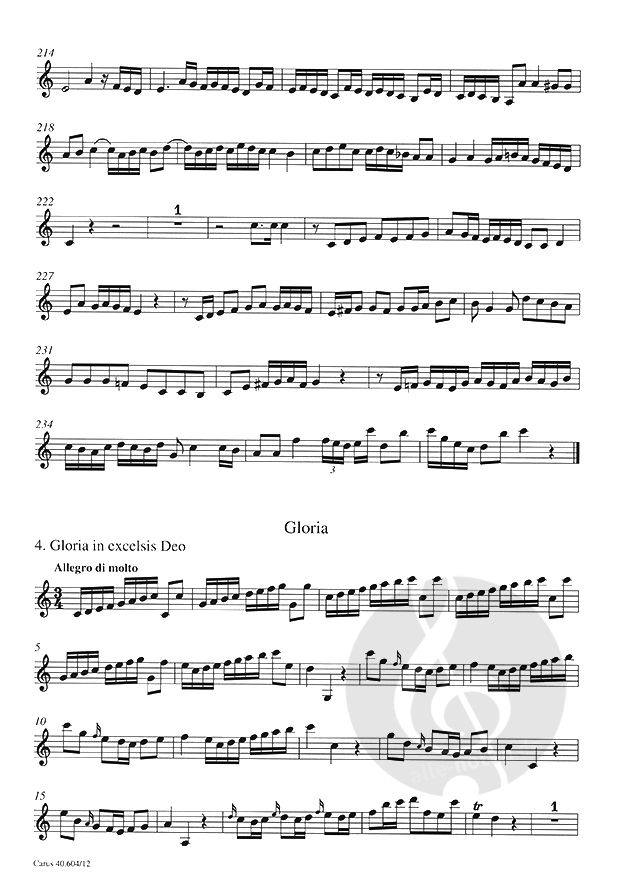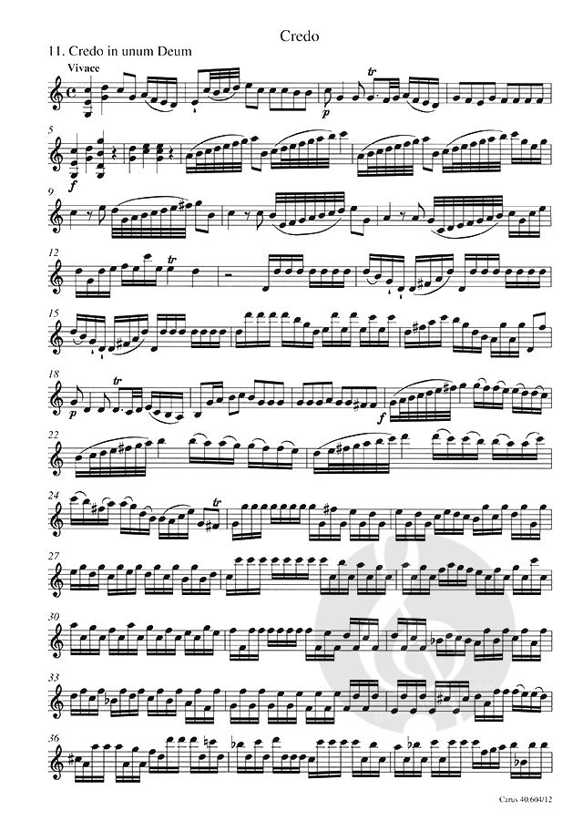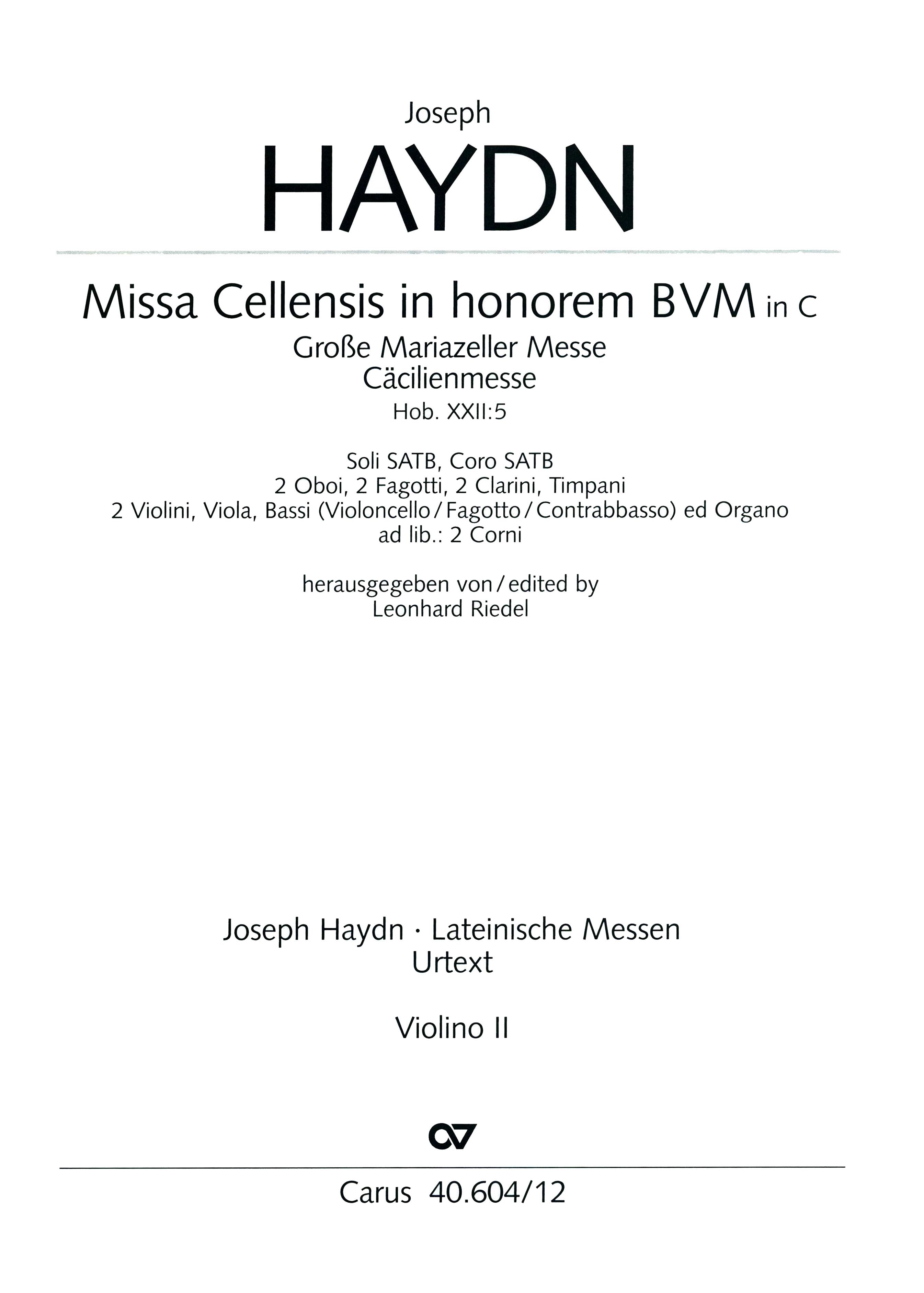Missa Cellensis in honorem BVM. Cäcilienmesse - CV40.604/00 - Als Joseph Haydn 1766, nach dem Tod seines Vorgängers Gregor Joseph Werner, die Leitung der Esterházy-Kapelle übernahm, begann er mit der Komposition seiner ersten und zugleich umfangreichsten Missa solemnis. Der Titel 'Missa Cellensis' (später auch 'Cäcilien-Messe') und das Datum auf einem Partiturautograph deuten an, dass das Werk wahrscheinlich im Auftrag des Fürsten Nicolaus Esterházy für das bevorstehende sechshundertjährige Jubiläum der Wallfahrtskirche im steiermärkischen Mariazell bestimmt war. Die Messe steht in Besetzung und Form noch in der spätbarocken Tradition der 'Nummern-Messe'. Im Unterschied zu den bisherigen Mischfassungen aus verschiedenen Quellen folgt die Neuausgabe der authentischen (ursprünglichen) Fassung nach den verlässlichsten Quellen. - Soli SATB, Coro SATB, 2 Ob, 2 Fg, 2 Ctr, Timp, 2 Vl, Va, Bc, [2 Cor im Benedictus], Org