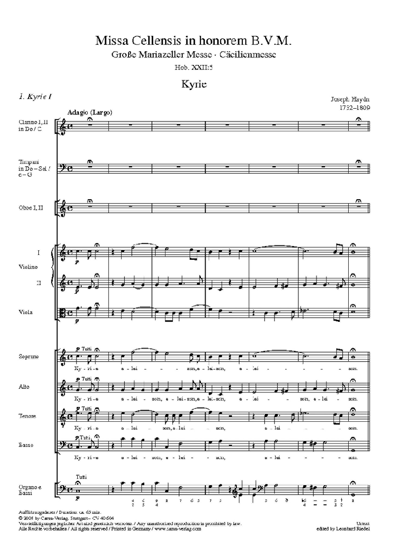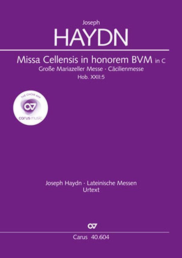 Missa Cellensis in honorem BVM. Cäcilienmesse - Als Joseph Haydn 1766, nach dem Tod seines Vorgängers Gregor Joseph Werner, die Leitung der Esterházy-Kapelle übernahm, begann er mit der Komposition seiner ersten und zugleich umfangreichsten Missa solemnis. Der Titel 'Missa Cellensis' (später auch 'Cäcilien-Messe') und das Datum auf einem Partiturautograph deuten an, dass das Werk wahrscheinlich im Auftrag des Fürsten Nicolaus Esterházy für das bevorstehende sechshundertjährige Jubiläum der Wallfahrtskirche im steiermärkischen Mariazell bestimmt war. Die Messe steht in Besetzung und Form noch in der spätbarocken Tradition der 'Nummern-Messe'. Im Unterschied zu den bisherigen Mischfassungen aus verschiedenen Quellen folgt die Neuausgabe der authentischen (ursprünglichen) Fassung nach den verlässlichsten Quellen. - Soli SATB, Coro SATB, 2 Ob, 2 Fg, 2 Ctr, Timp, 2 Vl, Va, Bc, [2 Cor im Benedictus], Org