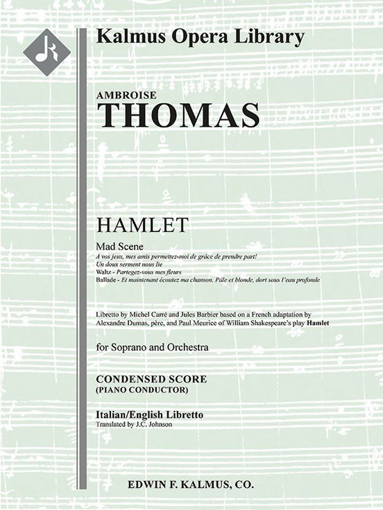 Hamlet was written by French composer Ambroise Thomas (1811-1896) in 1868, two years after the completion of his other well-known opera, Mignon. Michel Carré and Jules Barbier based their libretto on the French adaptation of Shakespeare's play by Alexandre Dumas, père, and there are significant plot departures made from the original to satisfy the French dramatic sensibilities of the time, including having Hamlet survive and be crowned king at the end. That the adaptation happened at all was driven by an obsession in Paris for the character Ophelia that began in 1827, and as such, her character, called Ophélie in the French, features more heavily in the opera. Arguably Ophélie most well-known part of the opera is the "Mad Scene" (Act 4) where, unable to account for Hamlet's rejection of her, her mind breaks, and she eventually drowns herself in the lake among the reeds. The scene and aria here includes: Recitative - A vos jeux, mes amis permettez-moi de grâce de prendre part! / "My friends, please allow me to join in your games!"; Andante - Un doux serment nous lie / "A tender promise binds us to each other"; Waltz - Partegez-vous mes fleurs / "Share my flowers"; Ballade - Et maintenant écoutez ma chanson. Pâle et blonde, dort sous l'eau profonde / "And now listen to my song. Pale and fair, sleeping under the deep water." This publication includes a full score in the original French, but both a French and an Italian/English piano conductor score are also available separately. Italian/English piano conductor score. Instrumentation: 2.2(1st dEH).1.2: 4.2.3.0: Timp.Perc(2): Str (4-4-3-3-3 in set).