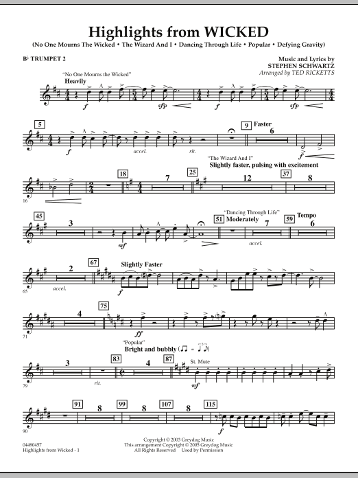 Broadway's powerful new hit is filled with engaging music and an intriguing story line based on the infamous Wicked Witch of the West. Veteran Broadway writer Stephen Schwartz's music has received critical acclaim and isskillfully adapted in this orchestra showcase by Ted Ricketts. Includes: No One Mourns the Wicked, The Wizard and I, Dancing Through Life, Popular, and Defying Gravity.