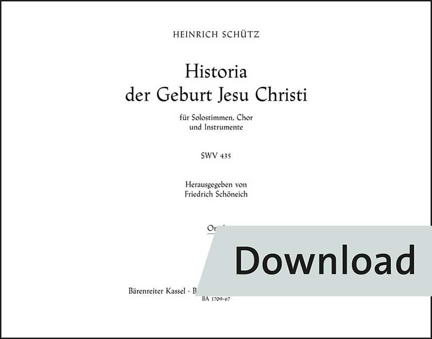 Weihnachtsoratorium für Solostimmen, Chor und Instrumente. Urtext der Neuen Schütz-Ausgabe. Sopran solo, Alt solo (3), Tenor solo (3), Bass solo (3), Gemischter Chor-SSATTB, Alt-Blockflöte in f,g (2), Fagott, Trompete (2), Posaune (2), Streicher, Basso continuo