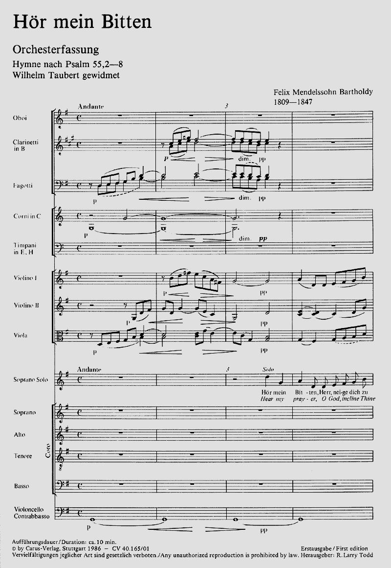 Galt Mendelssohns Anthem 'Hör mein Bitten' früher, besonders in der viktorianischen Zeit, als eine seiner bekanntesten geistlichen Kompositionen, so wurde es in jüngerer Zeit häufig übersehen zugunsten seiner grösseren Werke. Er schrieb die Hymne in vier miteinander verbunden Teilen; der häufige Wechsel zwischen Solo und Chor in der Partitur ruft das traditionelle englische Vers-Anthem in Erinnerung, obgleich der Wechsel hier mehr dem Text zugeordnet erscheint als einem vorgegebenen Formschema. Fassung 1: Solo S, Coro SATB, Org. Fassung 2: Solo S, Coro SATB, 2 Ob, 2 Clt, 2 Fg, 2 Cor, Timp, 2 Vl, Va, Vc/Cb