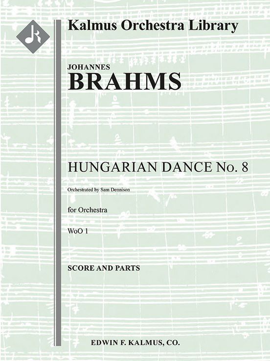 Originally written for piano four hands in 1879, Hungarian Dances (WoO 1), a set of 21 lively dance tunes mostly based on Hungarian themes, are among Johannes Brahms' (1833-1897) most popular works today. They have been arranged for many different instruments and ensembles over the years. In 1850, Brahms was introduced to "gypsy-style" music through Hungarian violinist Ede Reményi, including the csárdás "Bártfai emlék" (Memories of Bártfa) by Hungarian composer Béla Kéler, which became the basis for Hungarian Dance No. 5. Hungarian Dance No. 8 in A Minor, here orchestrated by Sam Dennison, invites comparison with the celebrated fifth dance and features lilting dotted rhythms and sudden key changes. Instrumentation: 2+Picc.2.2.2: 4.2.3.1: Timp.Perc(1): Str (9-8-7-6-5 in set).