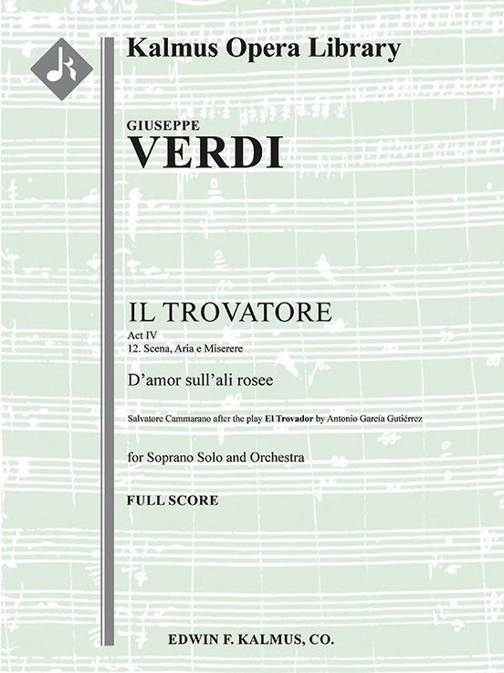 The creation of the opera Il Trovatore by Guiseppe Verdi (1813-1901) was complicated by a variety of circumstances. The original play by Garcia Gutierrez needed simplifying, and the traditional notions of Commarano, Verdi's three-time librettist, seemed at odds with his impulse for thematic depth. To add to complications, soon after Verdi started to work on it, Cammarano passed away, leaving him scrambling to find another librettist. Premiered at the Teatro Apollo in Rome on January 19, 1853, it quickly transcended the challenges of its genesis and became loved for its dark and fiery drama, vocal thrills, and famous innovations, including the familiar "Anvil Chorus" in Act 2. Its Italian-language premiere took place in Paris on December 23, 1854, and this is the version most often performed. In Act 4, Leonora sings "D'amor sull'ali rosee" as she lingers in disguise outside the prison where Manrico, the man she loves, is being held on account of trying to save his mother from execution. Instrumentation: 1.1.2.2: 1.0.0.0: Str (4-4-3-3-3 in set): Solo Soprano. Reprint edition.