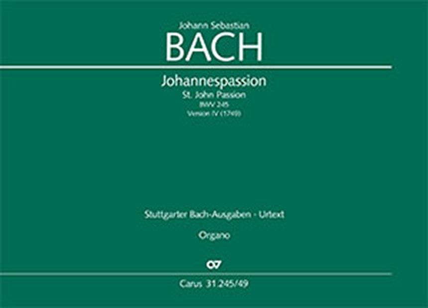 Soli SATBB, Coro SATB, 2 Fl, 2 Ob/Obda, Obca, Vga, 2 Vl, Va, Bc. Fassung IV - mit der unvollendeten Revision (1739) im Anhang. Ein Klavierauszug zu dieser Werkfassung liegt ebenfalls vor (Carus 31.245/03). Vollständiges Aufführungsmaterial in Vorbereitung. Die Johannespassion zählt zu den großen Vokalwerken der Leipziger Zeit Bachs. Im Gegensatz zu den übrigen oratorischen Werken hat Bach dieser Komposition jedoch nie eine endgültige Gestalt verliehen, sondern bei jeder Aufführung Änderungen vorgenommen. Sämtliche bisherigen Ausgaben vermischen die Lesarten der verschiedenen Quellenschichten. Dem von der Praxis immer wieder geäusserten Wunsch, eine der authentischen Bach'schen Fassungen zu musizieren, kommt diese Ausgabe nach und macht erstmals die vierte und letzte Fassung, welche von Bach 1749 aufgeführt wurde, zugänglich. Zugleich kann in Kombination mit dem Anhang traditionelle 'Mischfassung' aufgeführt werden.