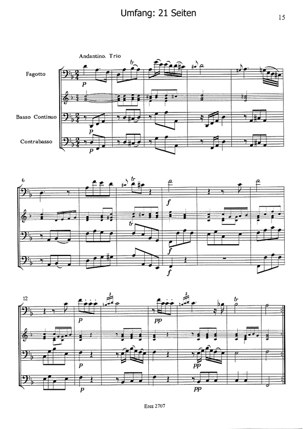 Streichorchester und Continuo: Herausgeber. Oliver RosteckDas Adolph Freiherr von Knigge auch geschickt im 'Umgang mit Tönen' war, wissen wir seit der Neuausgabe seiner 'Sechs Klaviersonaten' (eres 2181). Er versorgte aber nicht nur die Pianisten mit Tastenfutter, sondern dachte auch an die arg vernachlässigten Fagottisten, als er 1775 dieses Konzert komponierte. Eines der großen Vorzüge dieses frühklassischen, mit unbeschwerter Melodik daherkommenden Konzerts ist, dass es sowohl mit einem Streichorchester, wie auch solistisch aufgeführt werden kann, sodass die Fagottisten für die Bereicherung des Konzertrepertoires wie auch der Kammermusik mit Fagott dankbar sein werden.Dieses Konzert ist problemlos auch mit solistisch besetzten Streichern aufzuführen, vor allem wegen des nicht so hohen Schwierigkeitsgrades.Komponisten in BremenStimmen siehe unter eres 2707.9