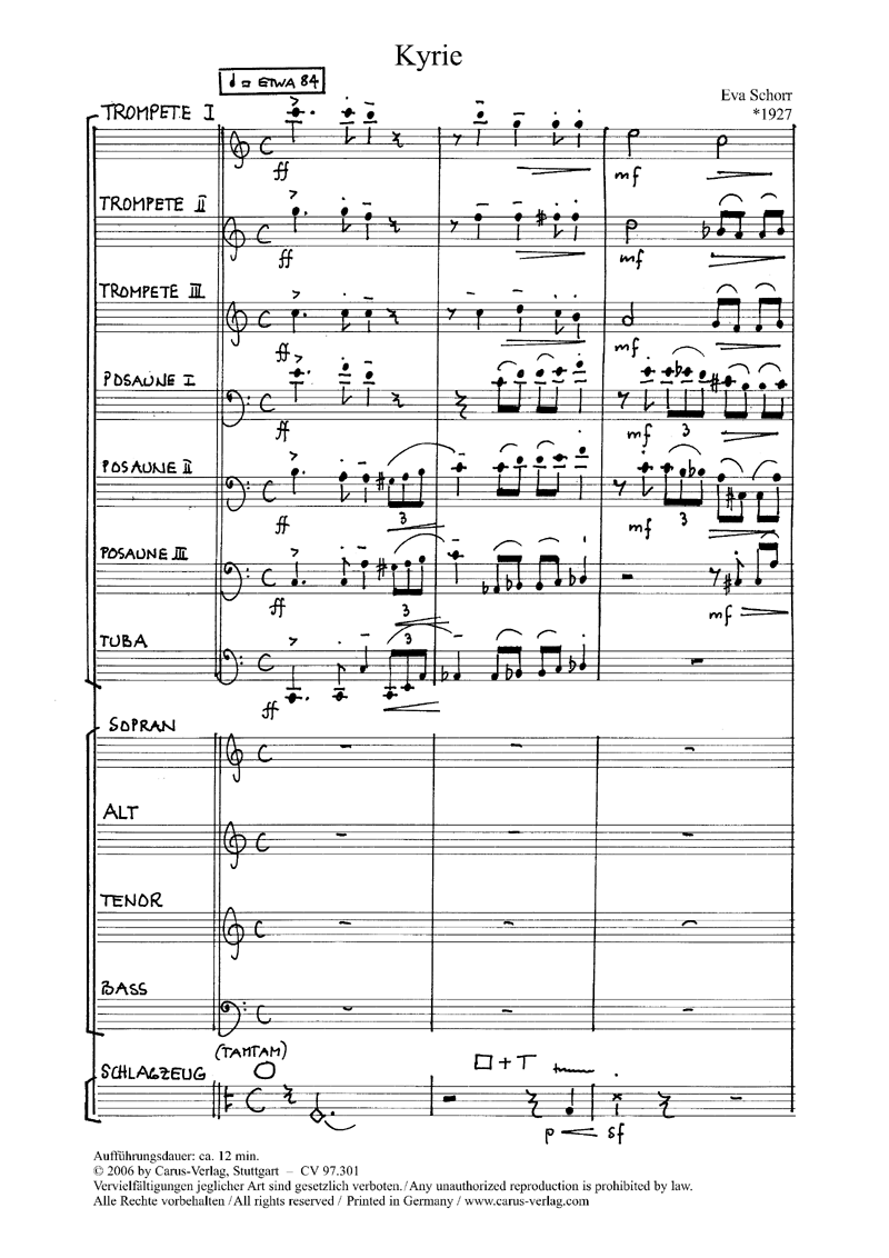 Coro SATB/SATB, 3 Tr, Trb, Tb, Vib, Glsp, Tamtam, 4 Tomtoms, 5 Becken, 4 Gongs, Kl Trommel, Schellentrommel, Pendelrassel