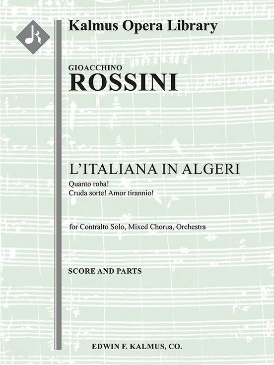 Premiering on May 22, 1813, at the Teatro San Benedetto in Venice, L'italiana in Algeri (The Italian Girl in Algiers) by Gioachino Rossini (1792-1868) was a success, with subsequent performances in Vicenza, Milan, and Naples. It was later performed at His Majesty's Theatre in London in 1819, and again in New York in 1832. Rossini's mixture of opera seria and opera buffa is notable — L'italiana in Algeri tells the tale of Isabella, an Italian girl who uses her wiles to trick unwitting Mustafà, the Bey of Algiers, into freeing her and her lover, Lindoro from his palace. The opera itself fell somewhat out of favor in the 19th century but has been revived frequently since World War II with many successful productions. The sorrowful cavatina Cruda sorte! Amor Tiranno! takes place in Act I, and serves as the introductory aria of Isabella, who finds herself shipwrecked in Algiers. The aria is preceded by the chorus Quanto Roba! Instrumentation: 2.2.2.2: 2.2.0.0: Str (4-4-3-3-3 in set): Solo Contralto: Mixed Chorus.