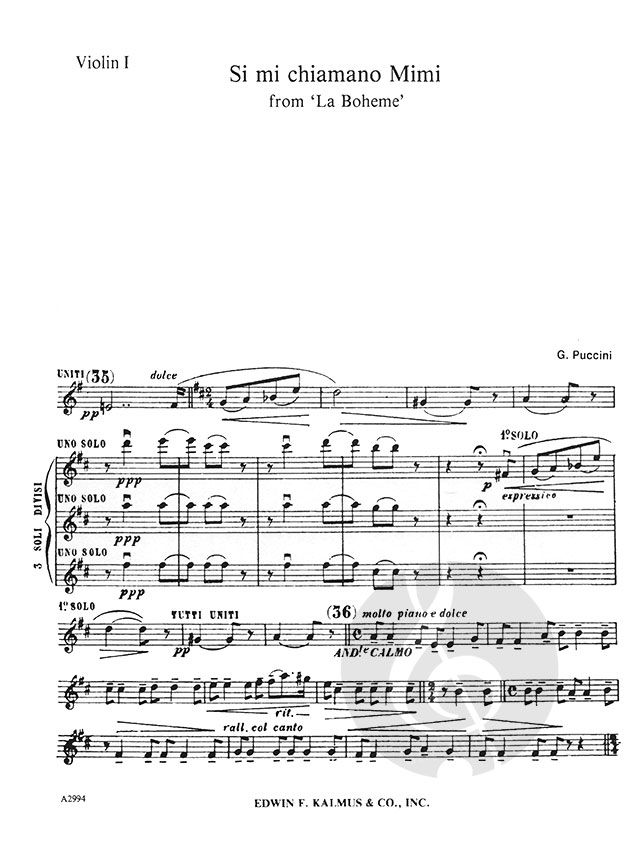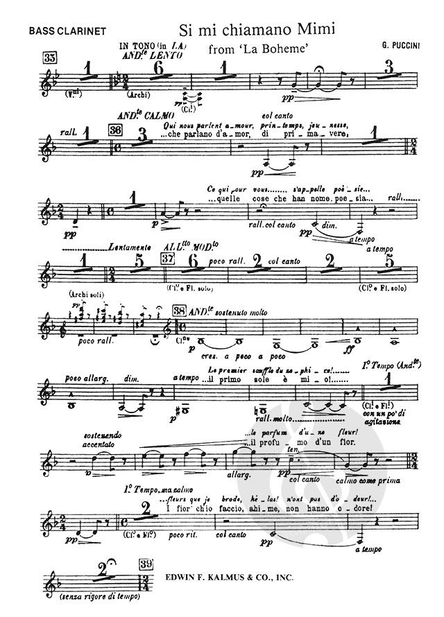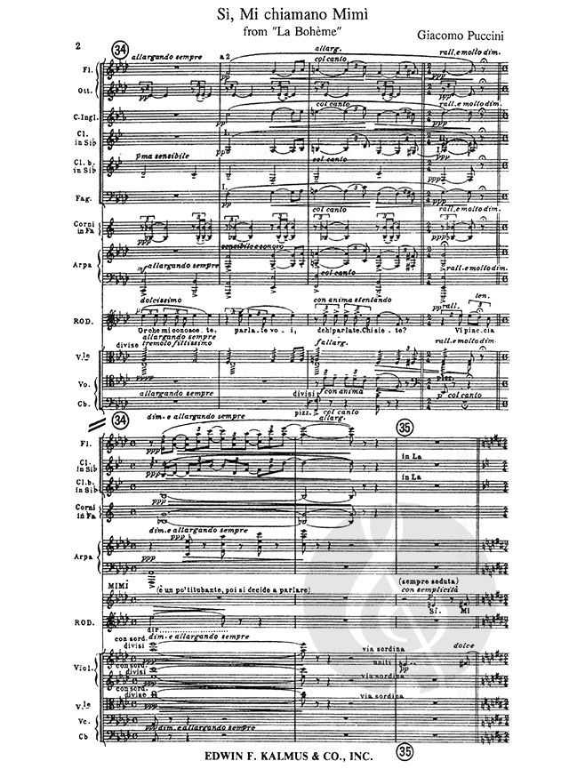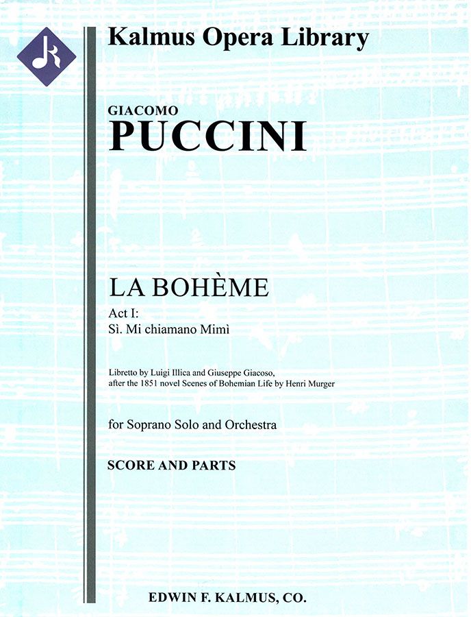 LA BOHÈME (The Bohemian), one of the most beloved and commercially-successful operas, is based on the 1851 novel Scenes of Bohemian Life by Henri Murger. With a libretto by Luigi Illica and Giuseppe Giacosa, Giacomo Puccini (1858-1924) worked on it from 1893 to 1895. It first appeared at the Teatro Regio in Turin on February 1, 1896, conducted by 28-year-old Arturo Toscanini. Weighed negatively against Turin's recent Italian premiere of the Wagner opera Gotterdammerung, it received a lukewarm response from audience and critics. A few months later, concertgoers filled opera houses on both sides of the Atlantic to hear it. In Act I, Rodolfo the painter has just met Mimi in the darkness of his garret while trying to look for a key she has lost. He introduces himself with an aria, then Mimi responds with her own, Sì, Mi chiamano Mimì (Yes, they call me Mimi). She describes a simple life, woven, like the embroidered flowers of her craft, with spring hopes and dreams. Instrumentation: 2+Picc.2+EH.2+BCl.2: 4.2.2.0: Timp.Perc(2): Hp: Str(4-4-3-3-3 in set): Solo Soprano. Reprint edition.