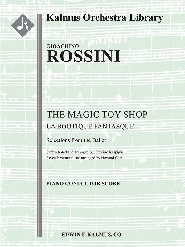 Die Musik für LA BOUTIQUE FANTASQUE (DER MAGISCHE SPIELZEUGLADEN), ein Ballett in einem Akt über eine Liebesgeschichte zwischen zwei Can-Can-Tanzpuppen in einem Spielzeugladen, basiert auf Klavierstücken, die Teil von Rossinis Péchés de vieillesse waren. Respighi stellte Rossinis Partitur dem Impresario Sergei Diaghilev vor, dessen Ballets Russes das Ballett am 5. Juni 1919 in London vor einem gespannt wartenden Publikum uraufführten. Diese Ausgabe enthält Ausschnitte, die von Howard Carr neu orchestriert wurden, darunter: Danse Cosaque, Nocturne, Mazurka, Tarentelle und Can-Can. Instrumentierung: 2d1.2.2.2: 2.2.3.0: Pauke: Perc(5): Harm: Str (4.4.3.3.3 im Satz).