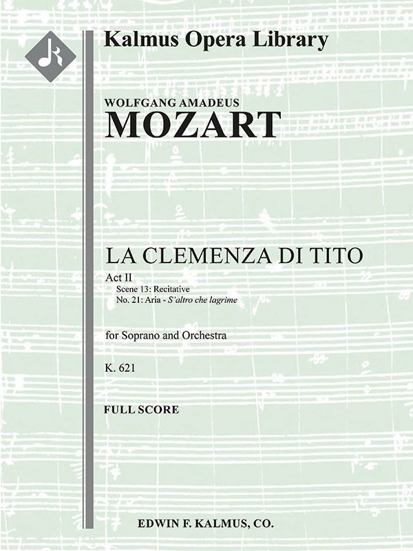 La Clemenza di Tito (Die Milde des Titus), KV 621 wurde von Wolfgang Amadeus Mozart (1756-1791) im Jahr 1791 geschrieben, nachdem er die Zauberflöte fast beendet hatte. Das Werk wurde zur Feier der Krönung von Leopold II., dem Kaiser des Heiligen Römischen Reiches, zum König von Böhmen in Auftrag gegeben, entstand in kürzester Zeit und galt als ein schwächeres Werk des jungen Komponisten. Im 20. Jahrhundert hat eine Neubewertung der Oper dazu geführt, dass sie zu den fünfzig meistgespielten Werken des Repertoires gehört. Das ursprüngliche dreiaktige Libretto von Pietro Metastasio, das die Geschichte des römischen Kaisers Titus und der Barmherzigkeit, die er seinen potenziellen Mördern entgegenbrachte, erzählt, wurde von zahlreichen anderen Komponisten bearbeitet, wobei Mozarts zweiaktige Fassung von Caterino Mazzolà überarbeitet wurde. Gegen Ende des zweiten Aktes erklärt Vitellia ihrer Schwester Servilia, wie schuldig sie sich fühlt, weil sie das fehlgeschlagene Attentat auf Titus inszeniert hat, während Sesto zum Tode verurteilt wird, um sie zu schützen. Servilia singt daraufhin die Arie S'altro Che Lagrime (manchmal auch S'altro Che Lacrime geschrieben), in der sie darauf hinweist, dass Tränen allein Sesto nicht retten werden. Die Sopranarie gehört zu den populärsten der Oper, die am 6. September 1791 in Prag im Ständetheater uraufgeführt wurde. Besetzungen: 1.1.0.1: 2.0.0.0: Str (4-4-3-3-3 im Satz): Solo Sop. (Vokalpartitur nicht enthalten).