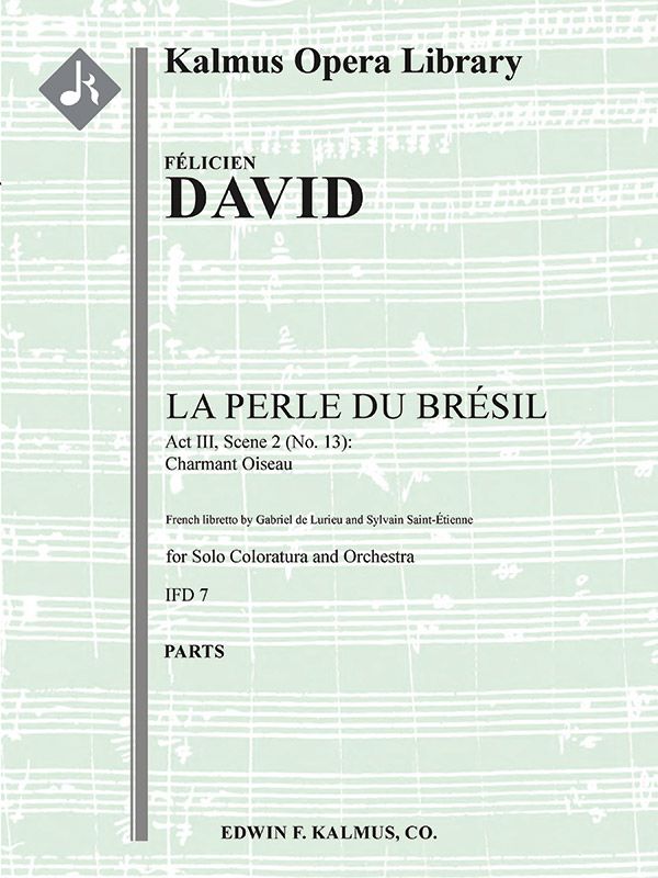 LA PERLE DU BRÉSIL (1851) ist ein lyrisches Drama von Félicien David, das auf ein Libretto von J. Gabriel und Sylvain Saint-Étienne basiert. Es wurde am 22. November 1851 von der Opéra-National im Théâtre Historique unter der Leitung von Edmond Seveste uraufgeführt. Es erzählt die Geschichte des jungen Leutnants Lorenz, der sich in Zora, eine Brasilianerin, verliebt. Admiral Salvador, der Mann, der sie zu ihrer Ausbildung nach Portugal gebracht hat, beschließt, sie nach Brasilien zurückzubringen. Als Matrose getarnt, wird Lorenz an Bord des Schiffes entdeckt, doch als ein Sturm sie in einen Hafen zwingt, werden sie von einer Gruppe feindseliger Eingeborener umzingelt. Als sie Zora erkennen, ziehen sie ihre Waffen zurück, und Salvador beschließt, seine Zustimmung zu geben, damit die beiden Liebenden heiraten können. Im 3. Akt preist Zora in CHARMANT OISEAU (THOU BRILLIANT BIRD) den fröhlichen Gesang eines Vogels und dessen Hingabe an einen Partner. Instrumentierung: 1.2.2.2: 4:0:0:0: Timp: Perc(1) Str(4.4.3.3.3 im Satz) [Koloraturstimme solo]: PARTITUR NICHT VERFÜGBAR.