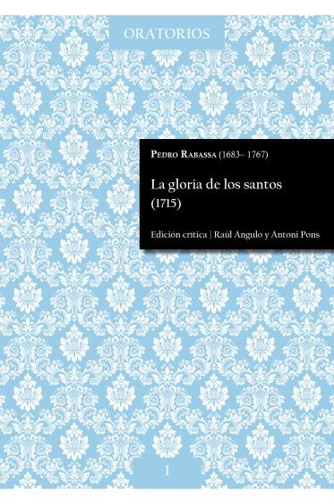 La gloria de los santos is the only preserved oratorio by Pedro Rabassa, although we know that he composed several. It was premiered in the church of the Congregation of San Felipe Neri of Valencia in 1715 and seems to have been the first oratorio to be presented in Palma de Mallorca, having been performed in the city's Oratory church on the 8th August 1717. We know that some years later in 1723 this oratorio was also performed in Córdoba. La gloria de los santos is an allegorical oratorio that exposes, in dialogue, what happens to the Soul when it is rewarded with divine glory.