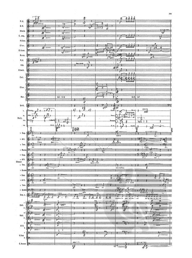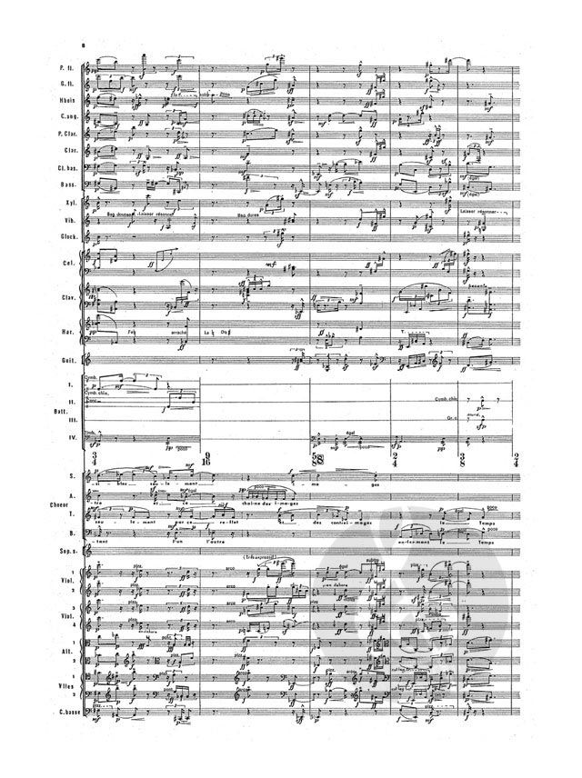 Sopran solo, Gemischter Chor-SATB, Flöte 1/ Piccolo, Flöte 2, Oboe, Englischhorn, Klarinette in b (2), Bass-Klarinette, Fagott, Harfe, Gitarre, Cembalo, Celesta, Vib, Xylophon, Glockenspiel, Schlagzeug (4), Streicher (Violine (4), Viola (2), Violoncello (2), Kontrabass - Partitur