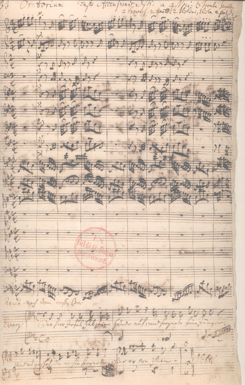 Himmelfahrtsoratorium - Faksimile nach dem Partiturautograph der Staatsbibliothek zu Berlin Preussischer Kulturbesitz. Festgabe anlässlich des Jubiläums 100 Jahre Bachhaus Eisenach Museum der Neuen Bachgesellschaft e.V. Das Faksimile wurde im hochwertigen Vierfarbdruck auf Spezialpapier gedruckt und farblich mit dem Original abgeglichen. Das mit Einführungstexten zweier namhafter Bach-Experten versehene Faksimile zeigt alle 32 Seiten des Autographs, das bereits durch den Tintenfrass angegriffen ist, und dient damit auch der Bewahrung des heutigen Zustandes dieses wertvollen Kulturguts. - Soli SATB, Coro SATB, 2 Fl, 2 Ob, 3 Trb, Timp, 2 Vl, Va, Bc