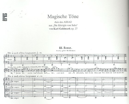 Arie für Tenor und Klavier aus der Oper ' Die Königin von Saba'. Diese Arie fehlt auf fast keiner Sängerportrait-CD in neuerer Zeit. Goldmarks Oper 'Die Königin von Saba' wurde in ihren besten Zeiten öfter als Wagners Opern aufgeführt!