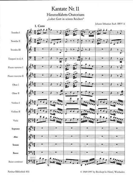 2. Fassung in D-Dur mit 4 Einlagesätzen der Es-Dur-Fassung (transponiert). Urtext der Neuen Bach-Ausgabe. Sopran solo (2), Alt solo, Tenor solo, Bass solo, Gemischter Chor-SSATB, Flöte (2), Oboe (2)/ Oboe d'amore, Trompete (3), Pauke, Streicher, Basso continuo - Partitur; Urtextausgabe
