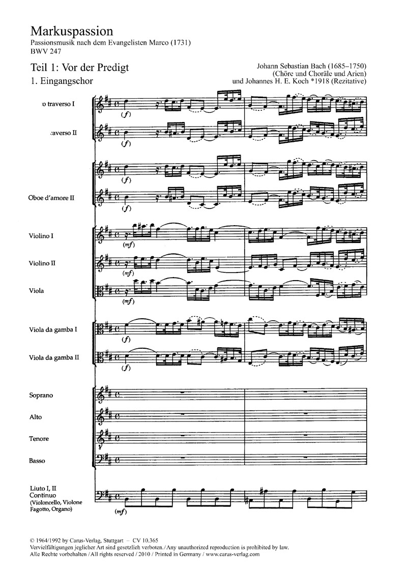 Version Koch - Bei der Aufführung der Markuspassion besteht die Schwierigkeit im Fehlen des Evangelienberichts. Johannes H. E. Koch hat diesen in seiner Tonsprache ergänzt. Bislang lag allerdings nur ein Klavierauszug der Fassung vor, jetzt ist auch die Partitur erschienen. Damit liegt das Werk mit dem kompletten Aufführungsmaterial vor.