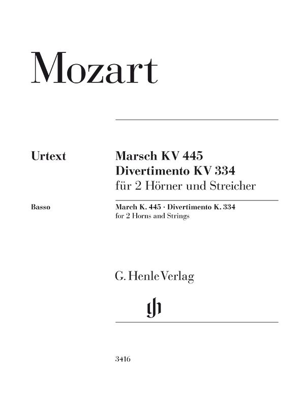 Über Mozarts bis heute populäres D-dur-Divertimento KV 334 wissen wir nur wenig: Ein Autograph ist nicht erhalten, in den zwei nach Mozarts Tod erschienenen Ausgaben umfasst es mal nur vier, mal hingegen sechs Sätze. Sehr wahrscheinlich handelt es sich bei dem Divertimento um eine in der Familienkorrespondenz der Mozarts mehrfach erwähnte "Robinische Musique", die 1780 für ein Mitglied der angesehenen Patrizierfamilie Robinig entstand, mit der die Mozarts einen freundschaftlichen Umgang pflegten. Traditionell wurde ein solches Divertimento mit einem Marsch als Auf- und Abzugsmusik kombiniert. Da der Marsch KV 445 mit dem Divertimento KV 334 Tonart und Besetzung gemeinsam hat und eine Datierung des Autographs auf Sommer 1780 denkbar ist, wird er in der vorliegenden Ausgabe dem Divertimento vorangestellt.