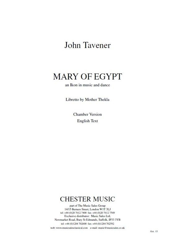 This is the Study Score for Mary Of Egypt by John Tavener, for Solo Voices, SATB Chorus and Orchestra. Please note that this is the Chamber Version, with lyrics in English. A full performance of this work lasts around 1 hour 40 minutes. Mary Of Egypt was originally commissioned by the Contemporary Opera Studio of English National Opera and the Aldeburgh Foundation, and first performed on 19th June 1992.
