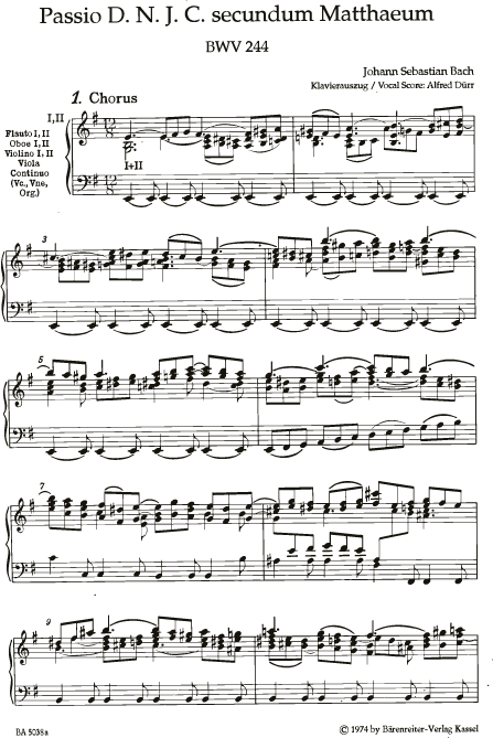 Passion unseres Herrn Jesu Christi nach dem Evangelisten Matthäus. Urtext der Neuen Bach-Ausgabe. Klavierauszug und Chorstimmen deutsch/englisch sowie Orgelkombinationsstimme statt Orgel-Chorus-I und Orgel-Chorus-II lieferbar. Sopran solo, Alt solo, Tenor solo (2), Bass solo (2), Gemischter Chor (2)-SATB, Orchester 1: Alt-Blockflöte in f,g (2), Flöte (2), Oboe (2)/ Oboe d'amore/ Oboe-dacc/ Englischhorn, Fagott, Viola da gamba, Streicher, Orgel, Orchester 2: Flöte (2), Oboe (2)/ Oboe d'amore, Fagott, Viola da gamba, Streicher, Orgel/ Cembalo - Partitur; Urtextausgabe; Gesamtausgabe
