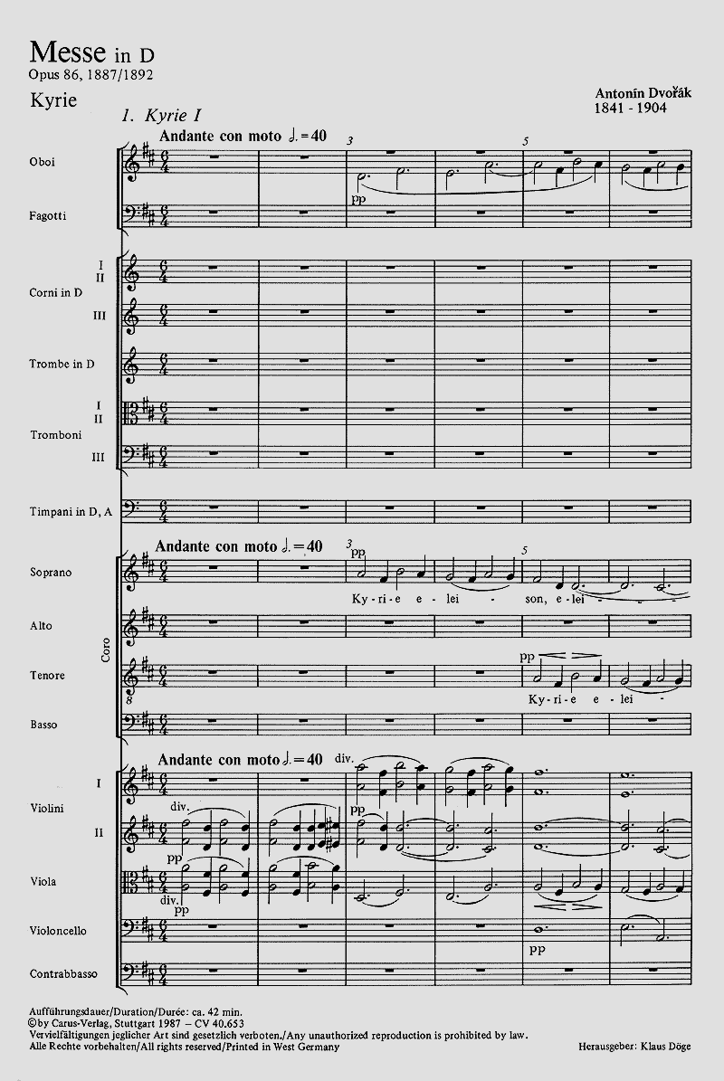 Neben dem Te Deum und dem Stabat Mater zählt Dvoráks D-Dur-Messe op. 86 zu den herausragenden Werken seines geistlichen Schaffens. Sie liegt als Orgel und Orchesterfassung vor. Seit ihrer Uraufführung 1893 im Londoner Crystal Palace hat sich die orchestrierte Version weltweit eine kontinuierliche Aufführungstradition geschaffen. Die Gründe für diesen Erfolg liegen im nur mittleren Schwierigkeitsgrad, in der Nähe zum klassisch-romantischen Stil (besonders zu Schubert), in der Vermeidung dramatischer Effekte sowie nicht zuletzt in jenem dezent folkloristischen Tonfall, der Dvoráks Werken generell eine konstante Beliebtheit sichert. Orchesterfassung: Soli SATB, Coro SATB, 2 Ob, 2 Fg, 3 Cor, 2 Tr, 3 Trb, Timp, 2 Vl, Va, Vc, Cb, Org; Orgelfassung: Soli SATB, Coro SATB, Org