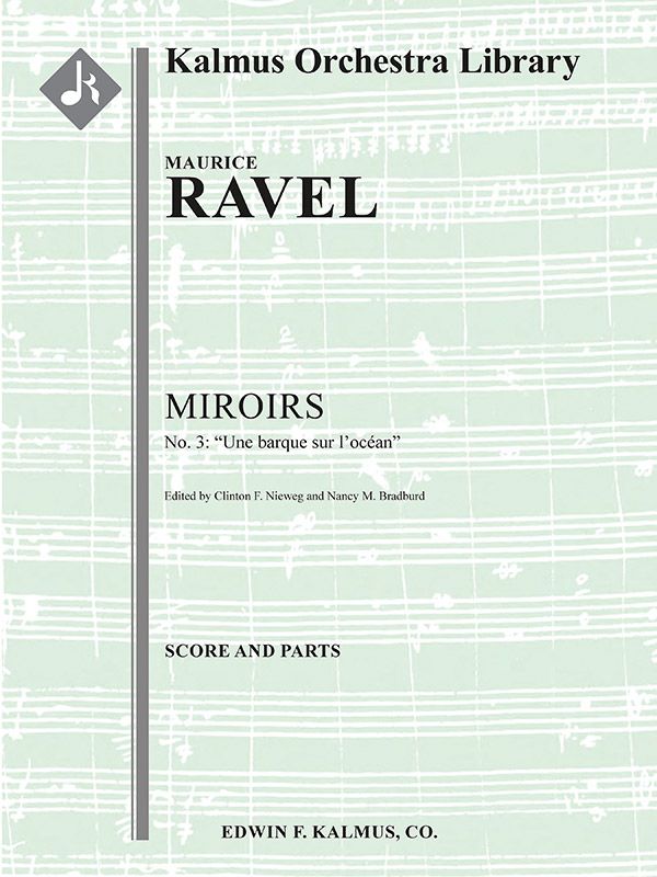 Die ursprünglich von Maurice Ravel (1875-1937) für Klavier solo geschriebene fünfsätzige Suite MIROIRS ("Spiegel") entstand zwischen 1904 und 1905, wobei jeder Satz einem anderen Mitglied der französischen Avantgarde-Künstlergruppe Les Apaches gewidmet war. Ravel orchestrierte später sowohl den dritten Satz mit dem Titel "Une barque sur l'océan" ("Ein Boot auf dem Ozean" - Paul Sordes gewidmet) als auch den vierten Satz mit dem Titel "Alborada del gracioso" ("Aubade des Narren" - Michel-Dimitri Calvocoressi gewidmet) selbst. Ernesto Halffter orchestrierte später den fünften Satz ("La vallée des cloches" - "Das Tal der Glocken" - Maurice Delage gewidmet), ebenso wie Percy Grainger, während Felix Günther den zweiten Satz ("Oiseaux tristes" - "Traurige Vögel" - Ricardo Viñes gewidmet) instrumentierte. Die Orchestrierung des ersten Satzes ("Noctuelles" - "Motten" - gewidmet Léon-Paul Fargue) ist jüngeren Datums. Die vorliegende Ausgabe der Transkription des Komponisten von "Une barque sur l'océan" wurde von Clinton Nieweg und Nancy Bradburd herausgegeben. Besetzungen: 3(2&3dPicc).2+EH.2+BCl.2: 4.2.3.1: Timp.Perc(3): Harp(2).Clst: Str (9-8-7-6-5).