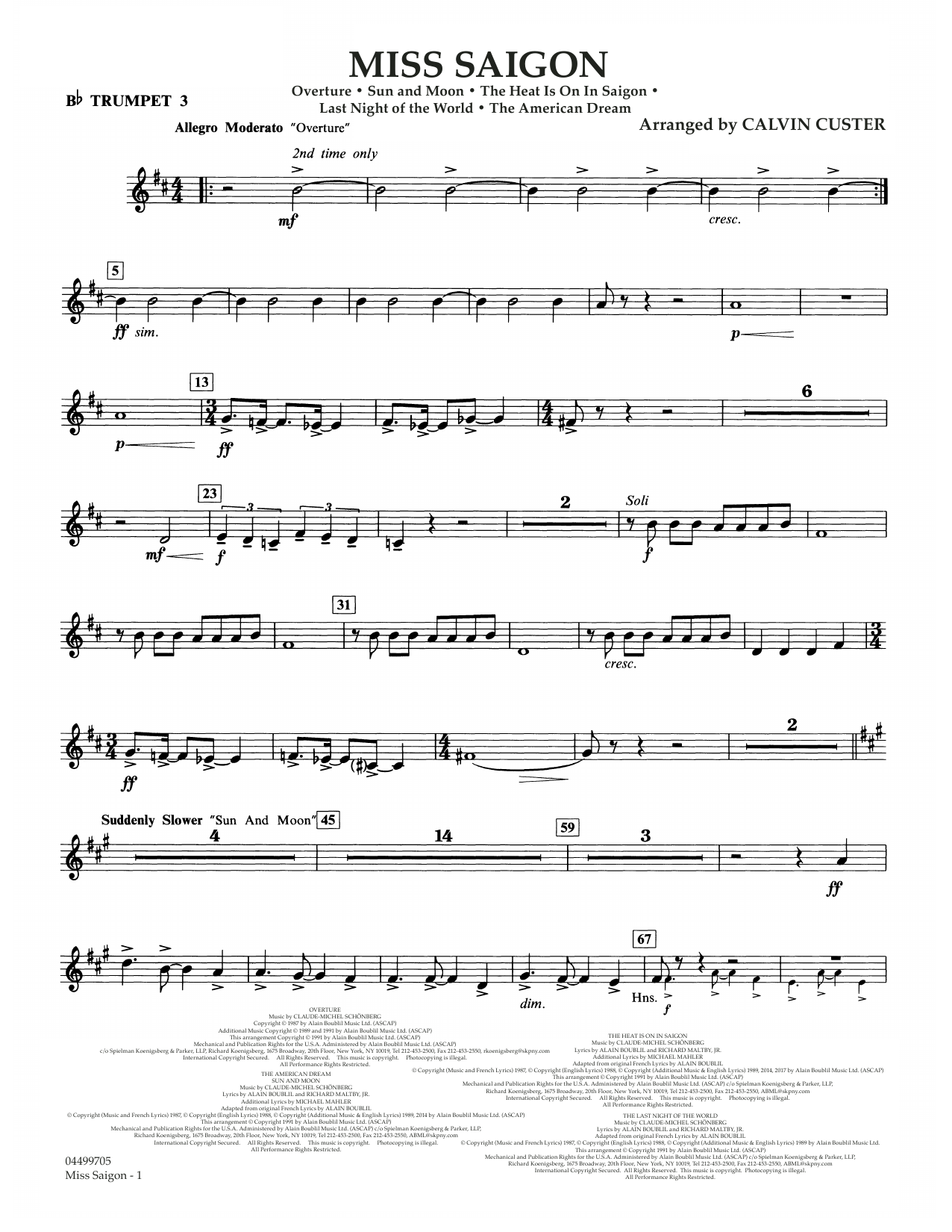 Das Medley aus den bekanntesten Melodien des Musicals wurde erstellt von Calvin Custer und beinhaltet: Overture • The Heat Is On in Saigon • Sun And Moon • The Last Night Of The World • The American Dream – (Grade 3,5)