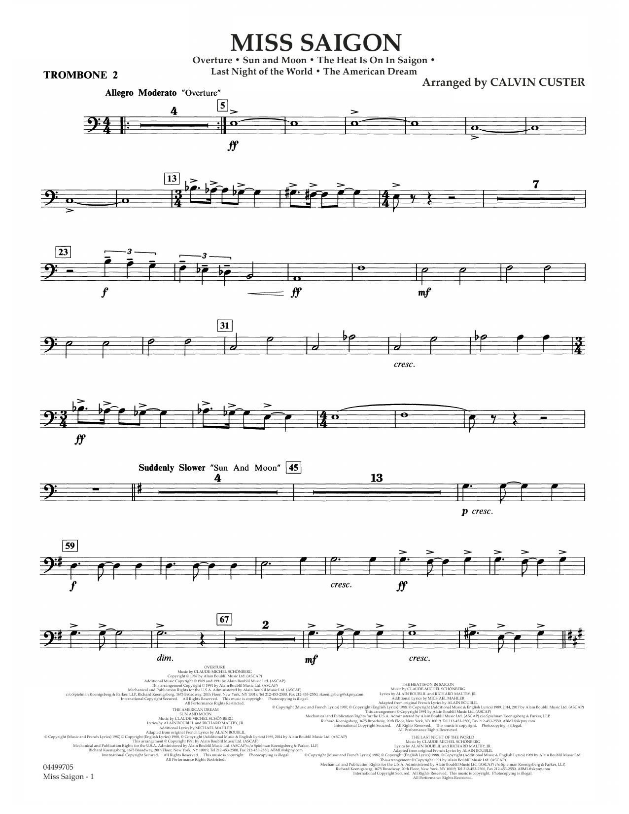 Das Medley aus den bekanntesten Melodien des Musicals wurde erstellt von Calvin Custer und beinhaltet: Overture • The Heat Is On in Saigon • Sun And Moon • The Last Night Of The World • The American Dream – (Grade 3,5)