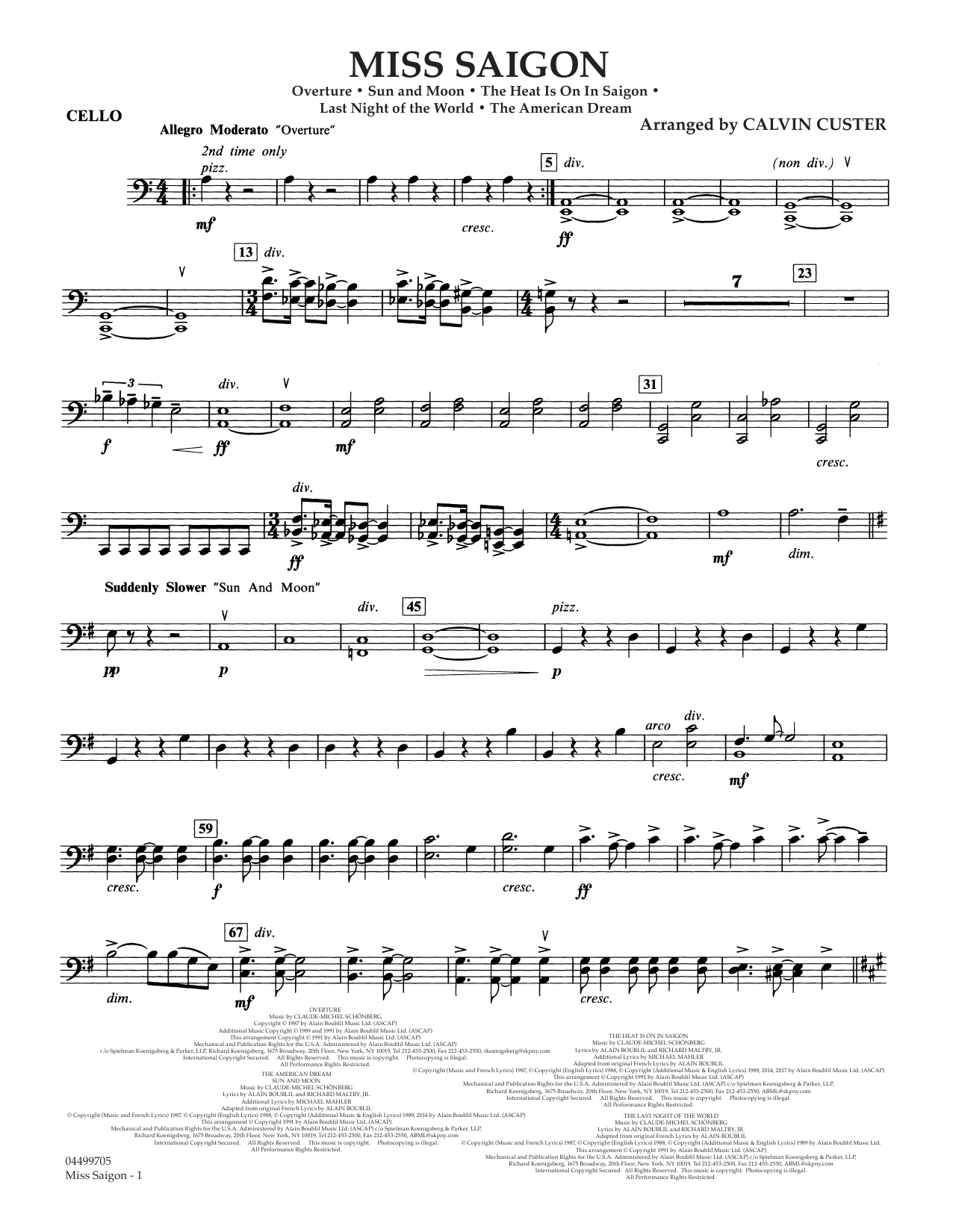 Das Medley aus den bekanntesten Melodien des Musicals wurde erstellt von Calvin Custer und beinhaltet: Overture • The Heat Is On in Saigon • Sun And Moon • The Last Night Of The World • The American Dream – (Grade 3,5)
