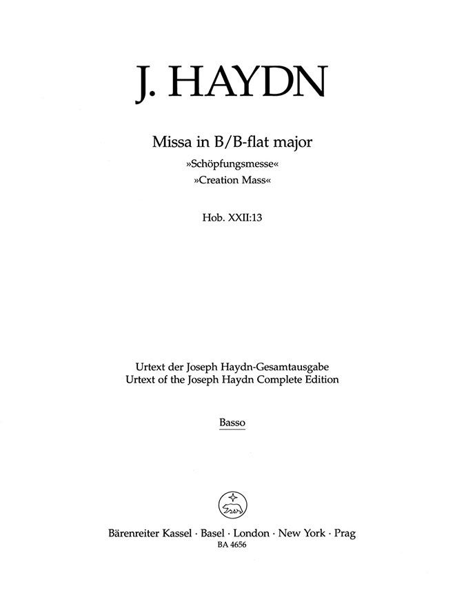 Urtext der Haydn-Gesamtausgabe. Sopran solo, Alt solo, Tenor solo, Bass solo, Gemischter Chor-SATB, Oboe (2), Klarinette in b (2), Fagott (2), Horn (2), Clarin-Trompete (2), Pauke, Streicher, Basso continuo