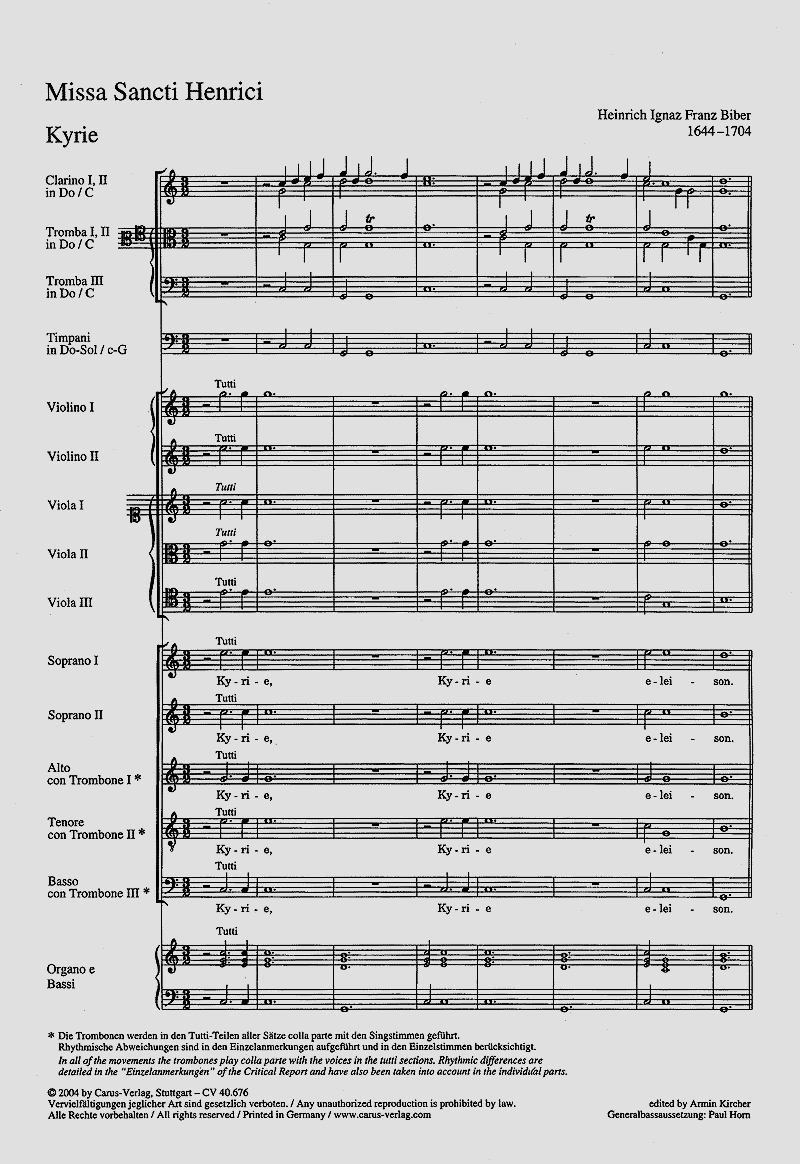 Die Missa Sancti Henrici gehört zu Bibers reifsten und umfangreichsten kirchenmusikalischen Werken. Im gekonnten Wechsel von 'stile antico' und 'stile moderno' sowie im Kontrast zwischen Solo und Tutti erzielt Biber eine abwechslungsreiche Gliederung innerhalb der einzelnen Sätze. Die architektonische Konzeption der Salzburger Domkirche mit den vier Kuppelpfeileremporen und den dazugehörigen Orgeln bildete die räumliche Voraussetzung für eine doppel- und mehrchörige Musizierpraxis nach venezianischem Vorbild. In Bibers prachtvollen geistlichen Werken gipfelt diese Tradition in einem für den Raum nördlich der Alpen einzigartigen kirchenmusikalischen 'Kolossalstil'. - Soli SSATB, Coro SSATB, 2 Ctr, 3 Tr, 3 Trb, Timp, 2 Vl, 3 Va, Bc (Vc/Fg/Cb, Org)