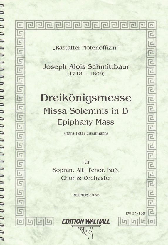 Dreikönigsmesse für Sopran, Alt, Tenor, Bass, Chor, 2 Fl, Fag, 2 Hr, 2 Trp, Pk, Str & B. c. (Orgel) aus dem Jahr 1776. Neuausgabe, herausgegeben von Hans Peter Eisenmann . Die Streicher im Stimmenset: 5-4-3-2-1; Doubletten sind separat zu bestellen.