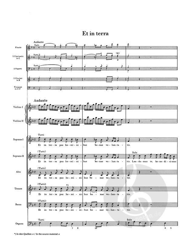 Frühe Streicherfassung und spätere Fassung mit Blasinstrumenten und Pauken. Urtext der Haydn Gesamtausgabe - Early version only for strings and later version with woodwinds, brass and timpani. Urtext of the Haydn Complete Edition. Sopran solo (2), Gemischter Chor-SATB, Flöte, Klarinette in b (2), Fg (2), Trompete (2), Pauke, Violine (2), Basso continuo - Partitur; Urtextausgabe