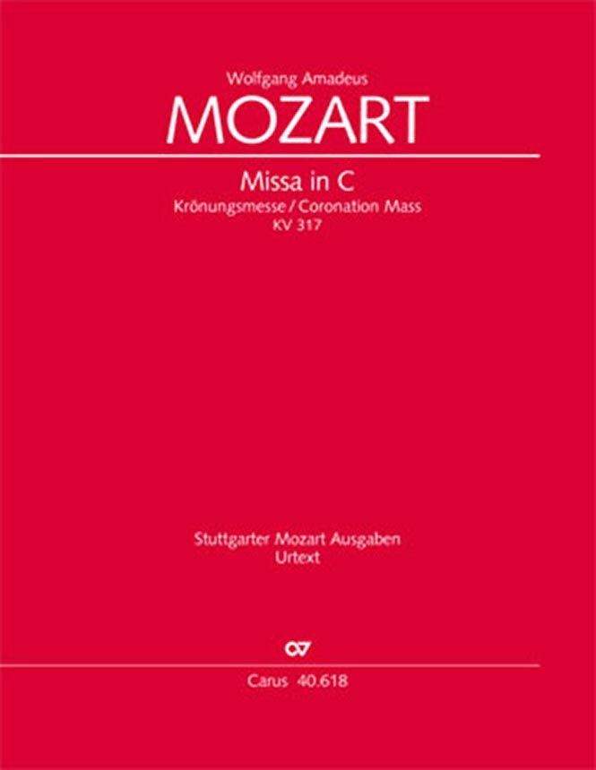 Mozarts Missa in C-Dur KV 317, unbegründeterweise Krönungsmesse genannt, zählt zu den beliebtesten und am meisten aufgeführten Werken ihrer Gattung. Das in vieler Hinsicht aufschlussreiche Autograph der Messe galt nach dem Zweiten Weltkrieg als verschollen, befindet sich jedoch, wie erst Ende der 1970er Jahre bekannt wurde, in der an musikalischen Schätzen reichen Biblioteka Jagiellonska in Kraków. Nach dieser einzigen zweifelsfrei authentischen Quelle hat der Herausgeber Ulrich Leisinger seine Edition erstellt, wobei im Kritischen Bericht eine frühe Stimmenabschrift (Fügerl) ergänzend mit ausgewertet wurde, da solche späteren Kopien in Detailfragen oft wichtige Aufschlüsse geben, etwa zu Fragen der historischen Aufführungspraxis. Soli SATB, Coro SATB, 2 Ob, 2 Cor, 2 Ctr, Timp, 2 Vl, Bc, [3 Trb]