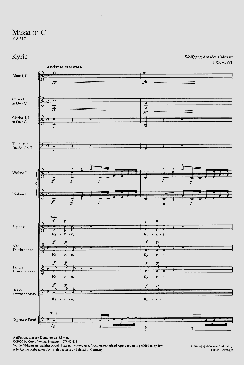 Krönungsmesse - Mozarts Missa in C-Dur KV 317, unbegründeterweise 'Krönungsmesse' genannt, zählt zu den beliebtesten und am meisten aufgeführten Werken ihrer Gattung. Das in vieler Hinsicht aufschlussreiche Autograph der Messe galt nach dem Zweiten Weltkrieg als verschollen, befindet sich jedoch, wie erst Ende der 1970er Jahre bekannt wurde, in der an musikalischen Schätzen reichen Biblioteka Jagiellonska in Kraków. Nach dieser einzigen zweifelsfrei authentischen Quelle hat der Herausgeber Ulrich Leisinger seine Edition erstellt, wobei im Kritischen Bericht eine frühe Stimmenabschrift (Fügerl) ergänzend mit ausgewertet wurde, da solche späteren Kopien in Detailfragen oft wichtige Aufschlüsse geben, etwa zu Fragen der historischen Aufführungspraxis. - Soli SATB, Coro SATB, 2 Ob, 2 Cor, 2 Ctr, Timp, 2 Vl, Bc, [3 Trb]