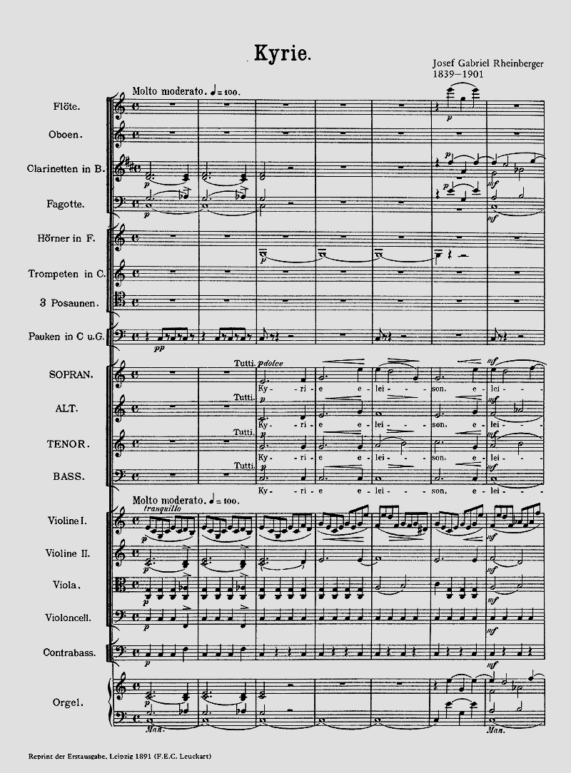 Obwohl Rheinberger ein beachtliches Repertoire an Musik für den Gottesdienst hinterlassen hat, ist die hier veröffentlichte 'C-Dur-Messe' op. 169 für Solostimmen, gemischten Chor und Orchester sein einziger Beitrag zur Gattung der Orchestermesse. Er behandelt die Solostimmen generell als Ensemble und lässt keine Einzelstimme arios hervortreten. Auch die Art der Stimmführung unterscheidet sich nicht von jener des Chores, und so besteht die wichtigste Funktion des Solistenquartetts darin, einen gleichsam 'registermässigen' Klangwechsel zum Tutti zu bilden. Soli SATB, Coro SATB, Orch: Version 1 (Orchesterfassung): Fl, 2 Ob, 2 Clt, 2 Fg, 2 Cor, 2 Tr, [3 Trb], Timp, 2 Vl, Va, Vc, Cb; Version 2 (Streicherfassung): 2 Vl, Va, Vc, Cb, Org