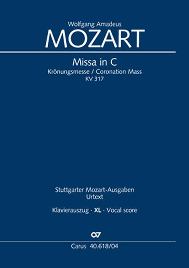 Mozarts Missa in C-Dur KV 317, unbegründeterweise Krönungsmesse genannt, zählt zu den beliebtesten und am meisten aufgeführten Werken ihrer Gattung. Das in vieler Hinsicht aufschlussreiche Autograph der Messe galt nach dem Zweiten Weltkrieg als verschollen, befindet sich jedoch, wie erst Ende der 1970er Jahre bekannt wurde, in der an musikalischen Schätzen reichen Biblioteka Jagiellonska in Kraków. Nach dieser einzigen zweifelsfrei authentischen Quelle hat der Herausgeber Ulrich Leisinger seine Edition erstellt, wobei im Kritischen Bericht eine frühe Stimmenabschrift (Fügerl) ergänzend mit ausgewertet wurde, da solche späteren Kopien in Detailfragen oft wichtige Aufschlüsse geben, etwa zu Fragen der historischen Aufführungspraxis. Soli SATB, Coro SATB, 2 Ob, 2 Cor, 2 Ctr, Timp, 2 Vl, Bc, [3 Trb]