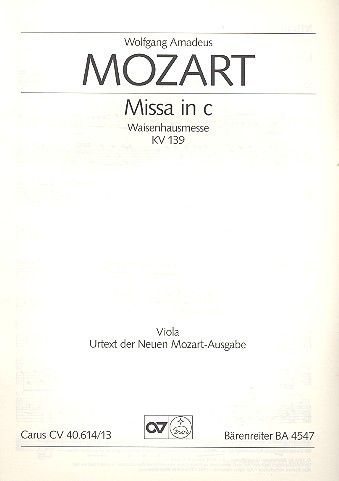 Waisenhausmesse - Bei Mozarts Missa in c-Moll KV 139 (114a) von 1768/69, der sog. Waisenhausmesse, handelt es sich sehr wahrscheinlich um den ersten Beitrag des Komponisten im Genre der Missa solemnis (mit Blechbläser), wie sie für kirchliche Hochfeste und andere besonders repräsentative geistliche Anlässe gepflegt wurde. Wie die Nähe von Kyrie und Agnus etwa zu Glucks 1762 in Wien uraufgeführter Oper 'Orfeo' (Furienszene, Eingangschor) zeigt, greift der junge Mozart in diesen Teilen der Messe unmittelbar auf bühnendramatische Ausdrucksmittel zurück. So besticht die Messe gerade durch ihre Kühnheit und lebhaften Kontraste, die Mozart in seinen späteren Messen eher vermeidet. Soli SATB, Coro SATB, 2 Ob, 2 Ctr, 2 Tr, 3 Trb, Timp, 2 Vl, 2 Va, Bc