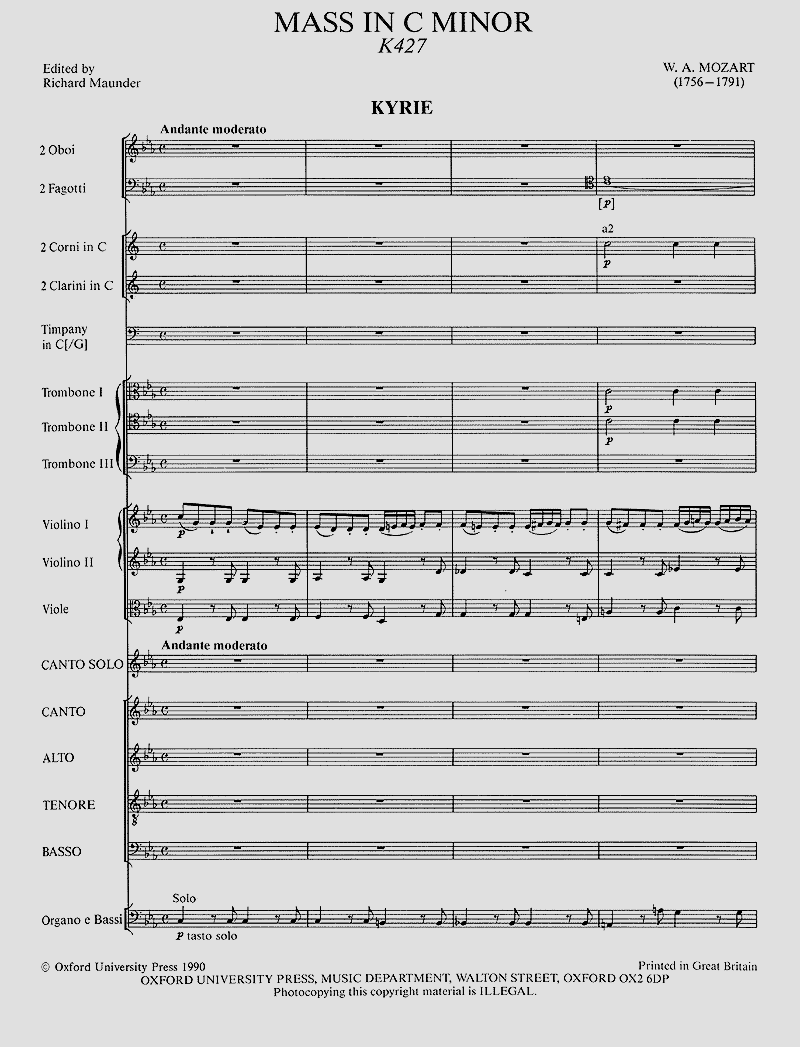 Mozart hat nur Kyrie, Gloria, Sanctus, 'Osanna' und Benedictus vollendet und zwei Sätze des Credo ('Credo in unum Deum', 'Et incarnatus est') entworfen, aber nicht vollständig instrumentiert. Im März 1785 arbeitete er Kyrie und Gloria, ergänzt durch eine Tenor- und eine Sopranarie zu dem italienischen Oratorium 'Davide penitente' um. Soli SATB, Coro SATB/SATB, Fl, 2 Ob, 2 Fg, 2 Cor, 2 Ctr, 3 Trb, Timp, 2 Vl, Va, Bc