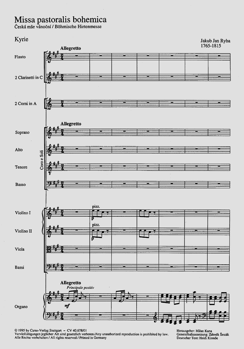 Böhmische Hirtenmesse - Frei gedichteter Messetext alternativ in deutscher oder tschechischer Sprache. Die Böhmische Hirtenmesse des Mozart-Zeitgenossen Ryba ist die bedeutendste der sogenannten tschechischen Weihnachtsmessen, bei denen es sich trotz der Bezeichnung 'Messe' um Folgen vokalinstrumentaler Szenen zum Thema der Geburt Christi handelt, die im weihnachtlichen Gottesdienst aufgeführt werden. Erzählt wird hier die Geschichte von vier tschechischen Hirten, denen die Geburt Christi verkündet wird und die das Kind in der Krippe besuchen. Die vorliegende Edition ist die erste Ausgabe des Werkes in seiner Originalgestalt. Soli SATB, Coro SATB, Fl, 2 Clt, 2 Cor, Tr, Timp, 2 Vl, Va, Vc/Cb, Org.