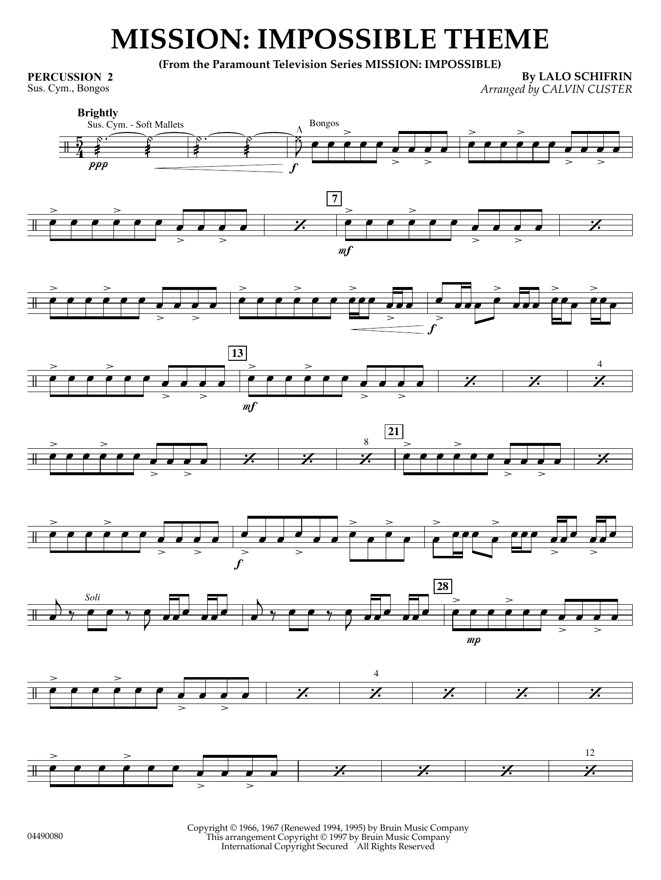 Noten der Titelmusik aus dem Film 'Mission: Impossible' für Sinfonieorchester, komponiert von Lalo Schifrin, arrangiert von Calvin Custer.
